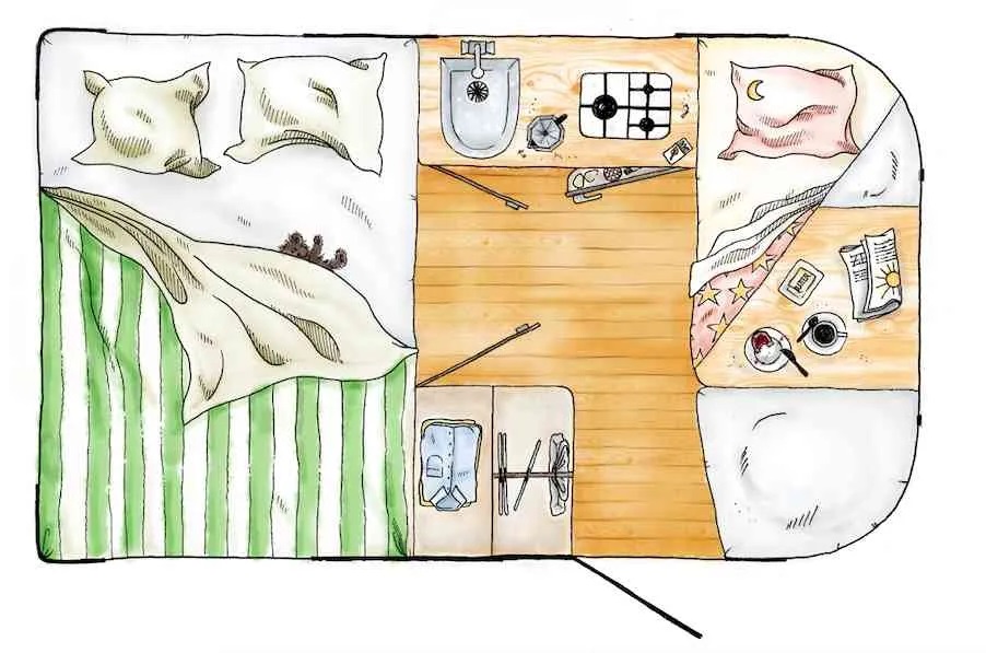 Die von uns entworfenen kleinen Wohnwagen haben eine Aufbaulänge von 3,40 m und eine Breite von 2,05 m. Die Gesamtlänge beträgt 4,90 m. Die Fahrzeuge werden für eine komfortable Nutzung von 2 Personen evtl. mit einem Kind konzipiert, wobei der hintere Teil als festes Bett (ca. 197 cm x 140 cm) mit Lattenrost oder als Umbausitzgruppe zu bestellen ist. Vorne befindet sich eine kleine Sitzgruppe mit einem schönen Rundumblick nach draußen, die auch als Zusatz- oder Kinderbett nutzbar ist.
